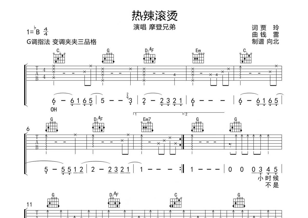 《热辣滚烫》是摩登兄弟刘宇宁演唱的一首歌曲,专辑版,拍号为4/4拍,歌曲原调为Bb调,但由于原调指法比较难,为了方便弹奏,本吉他谱采用的是G调指法编配,变调夹3品弹奏即为原调,当然也可以根据自己的音域改变变调夹位置,或者通过改变和弦调性,以方便自己弹奏,这份吉他谱共有三张高清图谱,图谱由 @圆创吉他谱 编配上传,图谱使用六线谱编配,包含吉他和弦指法、简谱以及歌词部分,曲谱配备了相关的音频提供试听,使用这份热辣滚烫吉他谱,可以让你更加方便地掌握这首歌曲的弹唱技巧,快来尝试吧。