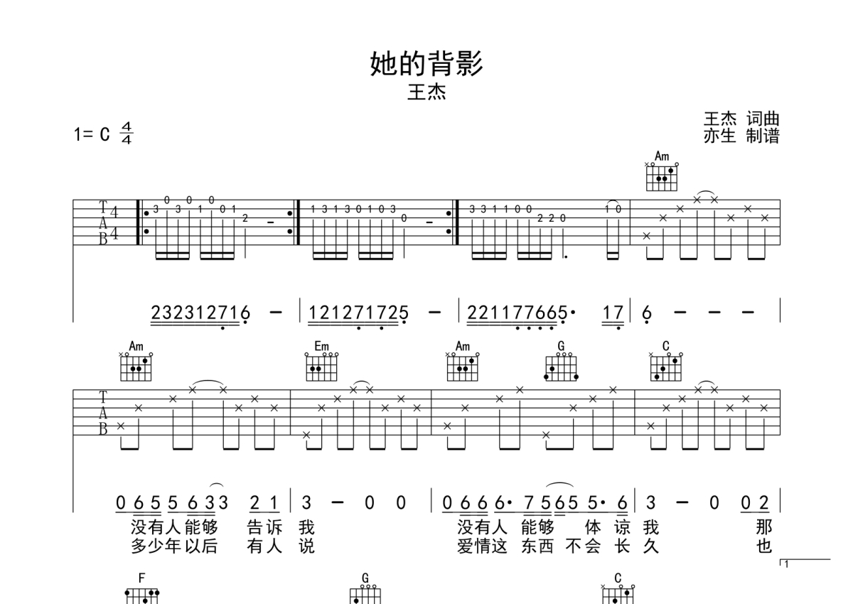 她的背影吉他谱 - 王杰 - C调弹唱六线谱