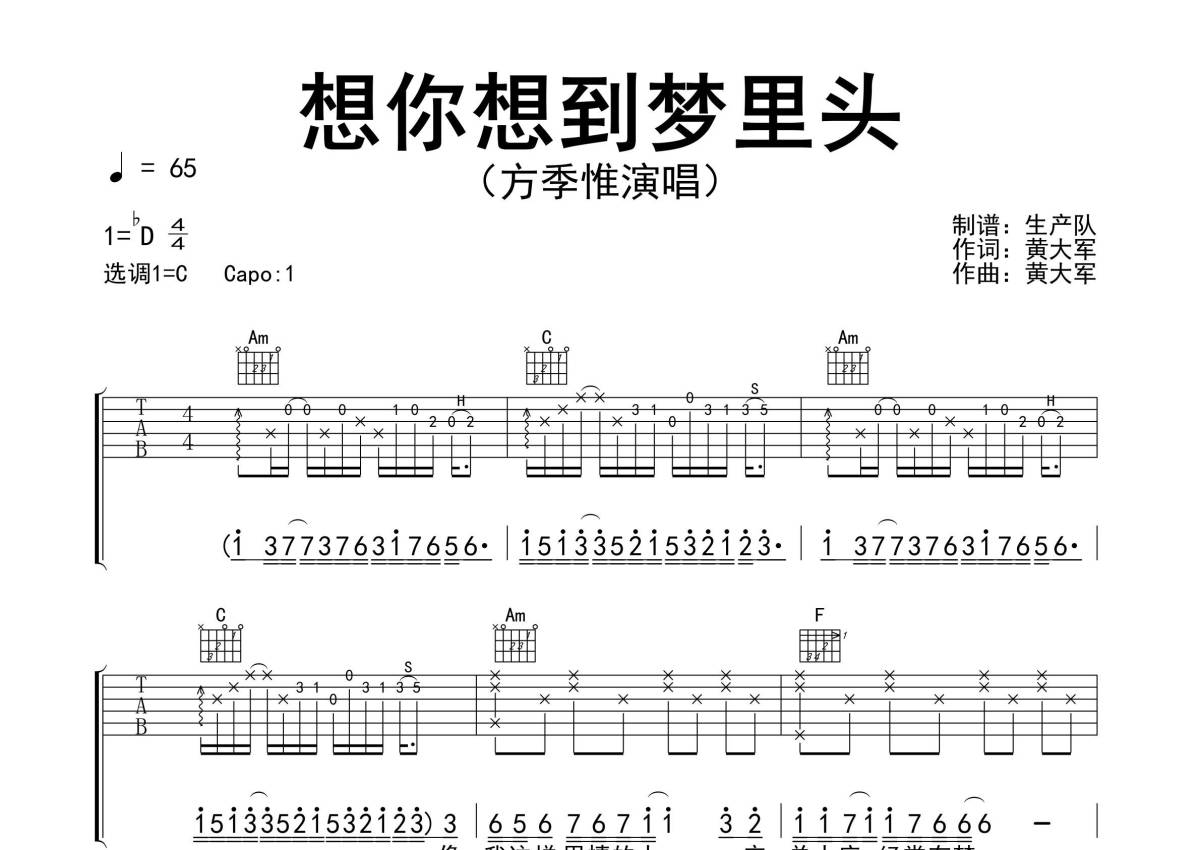 《想你想到梦里头》是方季惟演唱的一首歌曲,精编完美版,拍号为4/4拍,歌曲速度为每分钟65拍,歌曲原调为Db调,但由于原调指法比较难,为了方便弹奏,本吉他谱采用的是C调指法编配,变调夹1品弹奏即为原调,当然也可以根据自己的音域改变变调夹位置,或者通过改变和弦调性,以方便自己弹奏,这份吉他谱共有三张高清图谱,图谱由 @生产队 编配上传,图谱使用六线谱编配,包含吉他和弦指法、简谱以及歌词部分,使用这份想你想到梦里头吉他谱,可以让你更加方便地掌握这首歌曲的弹唱技巧,快来尝试吧。《想你想到梦里头》是一首由黄大军作词、作曲,方季惟演唱的歌曲,收录于专辑《典藏岁月2》中。本吉他谱根据原版C调指法编配,完整的前奏、间奏、尾奏编配,怀旧经典!。