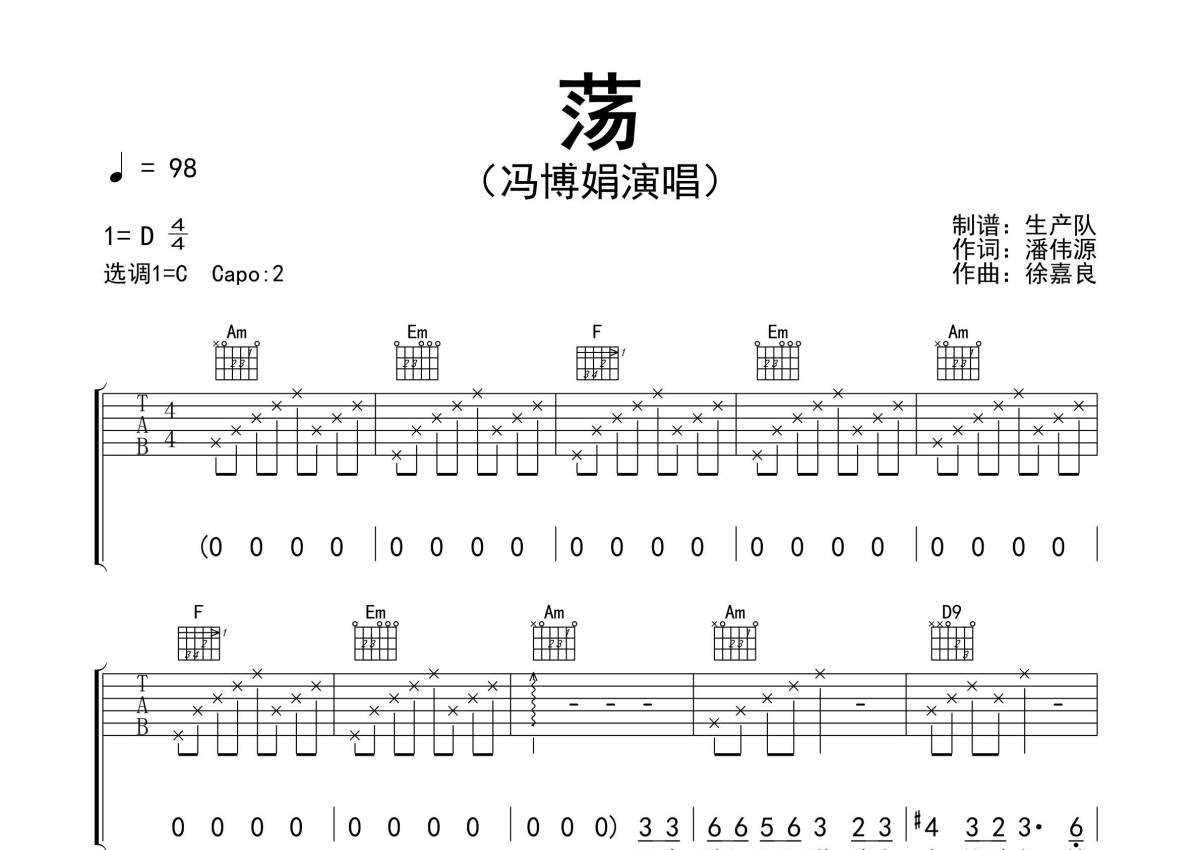 《荡》是冯博娟演唱的一首歌曲,精编民谣版,拍号为4/4拍,歌曲速度为每分钟98拍,歌曲原调为Db调,但由于原调指法比较难,为了方便弹奏,本吉他谱采用的是C调指法编配,变调夹1品弹奏即为原调,当然也可以根据自己的音域改变变调夹位置,或者通过改变和弦调性,以方便自己弹奏,这份吉他谱共有三张高清图谱,图谱由 @生产队 编配上传,图谱使用六线谱编配,包含吉他和弦指法、简谱以及歌词部分,使用这份荡吉他谱,可以让你更加方便地掌握这首歌曲的弹唱技巧,快来尝试吧。《荡》是由潘源良作词,徐嘉良作曲,冯博娟演唱的歌曲,收录于同名专辑《爱的太天真》中。本吉他谱根据原版C调指法编配,完整的前奏、间奏、尾奏编配,精编民谣版,怀旧经典!。