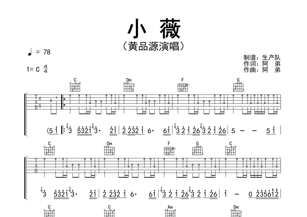 《小薇》是黄品源演唱的一首歌曲,精编完美版,拍号为4/4拍,歌曲速度为每分钟78拍,歌曲原调为C调,本吉他谱采用的是C调指法编配,演奏时不需要使用变调夹即为原调,这份吉他谱共有两张高清图谱,图谱由 @生产队 编配上传,图谱使用六线谱编配,包含吉他和弦指法、简谱以及歌词部分,使用这份小薇吉他谱,可以让你更加方便地掌握这首歌曲的弹唱技巧,快来尝试吧。《小薇》是由阿弟作词、作曲,黄品源演唱的经典歌曲,收录于2002年11月1日发行的专辑《简单情歌》,2003年8月3日,该曲获得香港新城国语力歌曲奖。本吉他谱根据原版C调指法编配,精准的前奏、间奏、尾奏和SOLO编配,怀旧经典!。