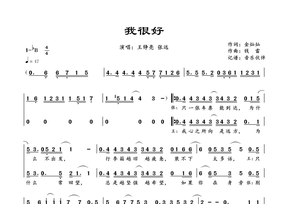 《我很好》是王铮亮/张远演唱的一首歌曲,拍号为4/4拍,歌曲速度为每分钟47拍,这份简谱共有两张高清图谱,图谱由 @音乐伙伴 编配上传。