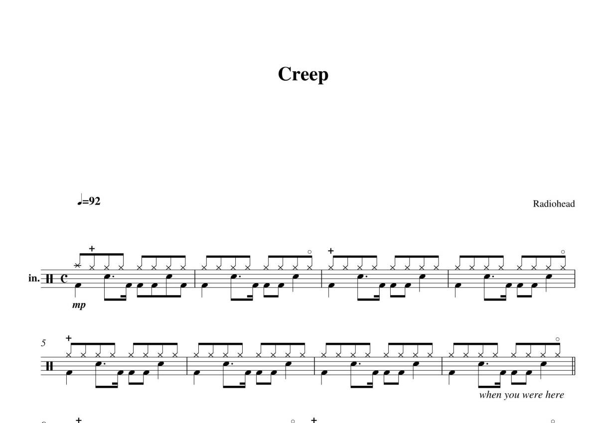 《Creep》是Radiohead演唱的一首歌曲,拍号为4/4拍,歌曲速度为每分钟92拍,这份架子鼓谱共有两张高清图谱,图谱由 @微信用户 编配上传,图谱使用五线谱编配,使用这份Creep架子鼓谱,你将能够轻松地敲打出这首Radiohead的Creep,快来尝试吧。