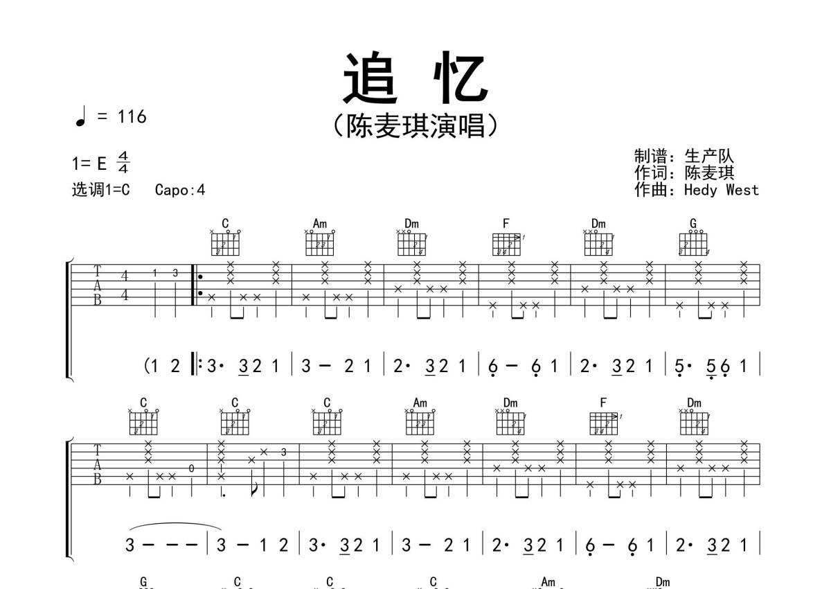 《追忆》是陈麦琪演唱的一首歌曲,精编完美版,拍号为4/4拍,歌曲速度为每分钟117拍,歌曲原调为E调,但由于原调指法比较难,为了方便弹奏,本吉他谱采用的是C调指法编配,变调夹4品弹奏即为原调,当然也可以根据自己的音域改变变调夹位置,或者通过改变和弦调性,以方便自己弹奏,这份吉他谱共有三张高清图谱,图谱由 @生产队 编配上传,图谱使用六线谱编配,包含吉他和弦指法、简谱以及歌词部分,使用这份追忆吉他谱,可以让你更加方便地掌握这首歌曲的弹唱技巧,快来尝试吧。《追忆》是由陈麦琪根据欧美经典歌曲《500miles》创作的一首民谣歌曲。本吉他谱根据原版C调指法编配,精准的前奏、间奏和SOLO编配,值得推荐的民谣歌曲!。
