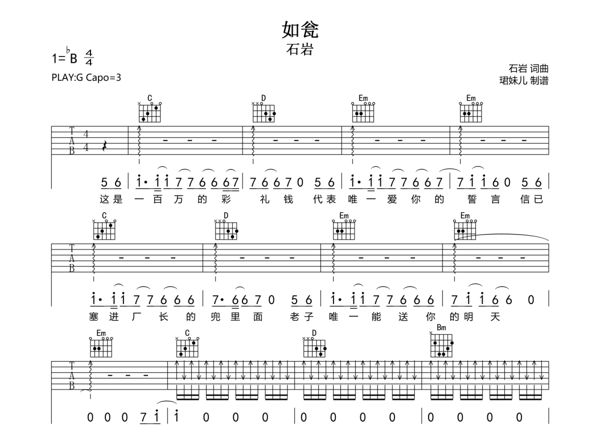 《如瓮》是石岩演唱的一首歌曲,拍号为4/4拍,歌曲速度为每分钟85拍,歌曲原调为Bb调,但由于原调指法比较难,为了方便弹奏,本吉他谱采用的是G调指法编配,变调夹3品弹奏即为原调,当然也可以根据自己的音域改变变调夹位置,或者通过改变和弦调性,以方便自己弹奏,这份吉他谱共有三张高清图谱,图谱由 @珺妹儿 编配上传,图谱使用六线谱编配,包含吉他和弦指法、简谱以及歌词部分,使用这份如瓮吉他谱,可以让你更加方便地掌握这首歌曲的弹唱技巧,快来尝试吧。