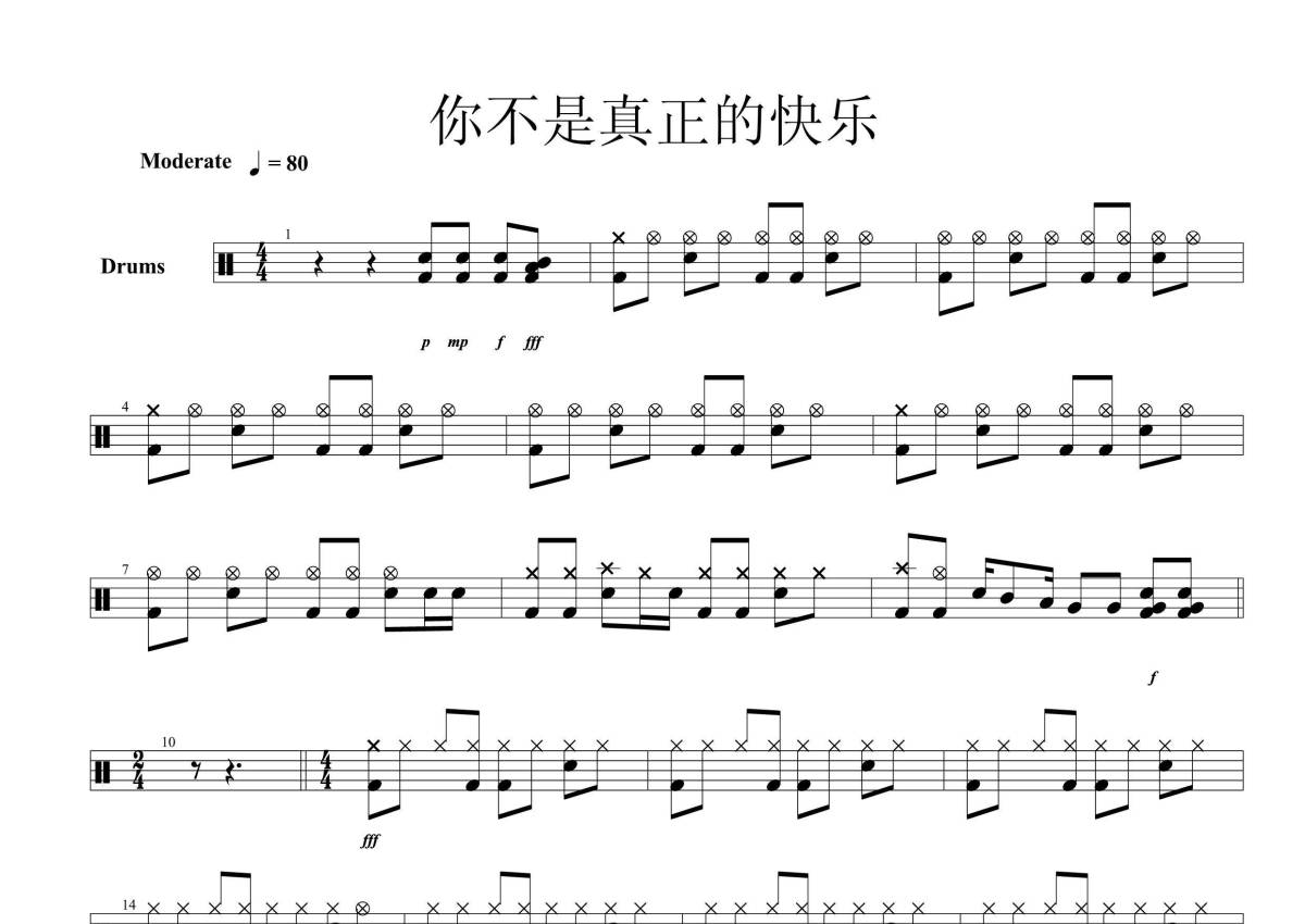《你不是真正的快乐》是五月天演唱的一首歌曲,拍号为4/4拍,歌曲速度为每分钟80拍,这份架子鼓谱共有四张高清图谱,图谱由 @微信用户 编配上传,图谱使用五线谱编配,使用这份你不是真正的快乐架子鼓谱,你将能够轻松地敲打出这首五月天的你不是真正的快乐,快来尝试吧。