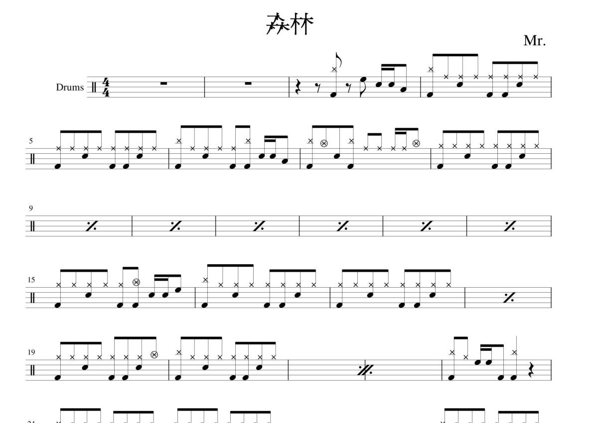 《森林》是Mr演唱的一首歌曲,拍号为4/4拍,这份架子鼓谱共有两张高清图谱,图谱由 @微信用户 编配上传,图谱使用五线谱编配,使用这份森林架子鼓谱,你将能够轻松地敲打出这首Mr的森林,快来尝试吧。