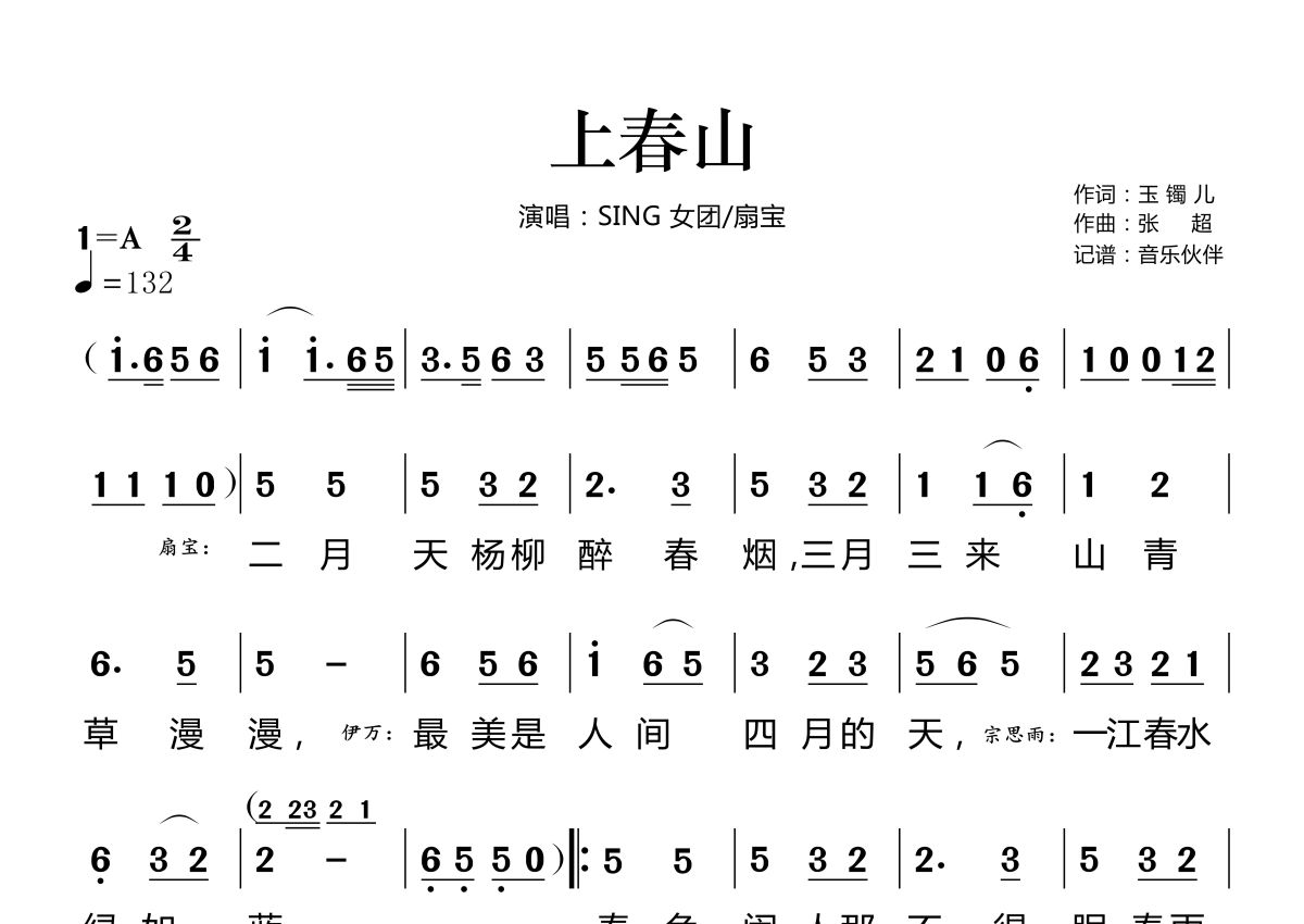 《上春山》是SING 女团/扇宝/演唱的一首歌曲,这份简谱共有两张高清图谱,图谱由 @音乐伙伴 编配上传。