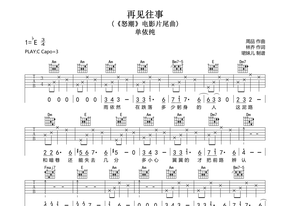 《再见往事》是单依纯演唱的一首歌曲,拍号为3/4拍,歌曲速度为每分钟85拍,歌曲原调为Eb调,但由于原调指法比较难,为了方便弹奏,本吉他谱采用的是C调指法编配,变调夹3品弹奏即为原调,当然也可以根据自己的音域改变变调夹位置,或者通过改变和弦调性,以方便自己弹奏,这份吉他谱共有两张高清图谱,图谱由 @珺妹儿 编配上传,图谱使用六线谱编配,包含吉他和弦指法、简谱以及歌词部分,使用这份再见往事吉他谱,可以让你更加方便地掌握这首歌曲的弹唱技巧,快来尝试吧。