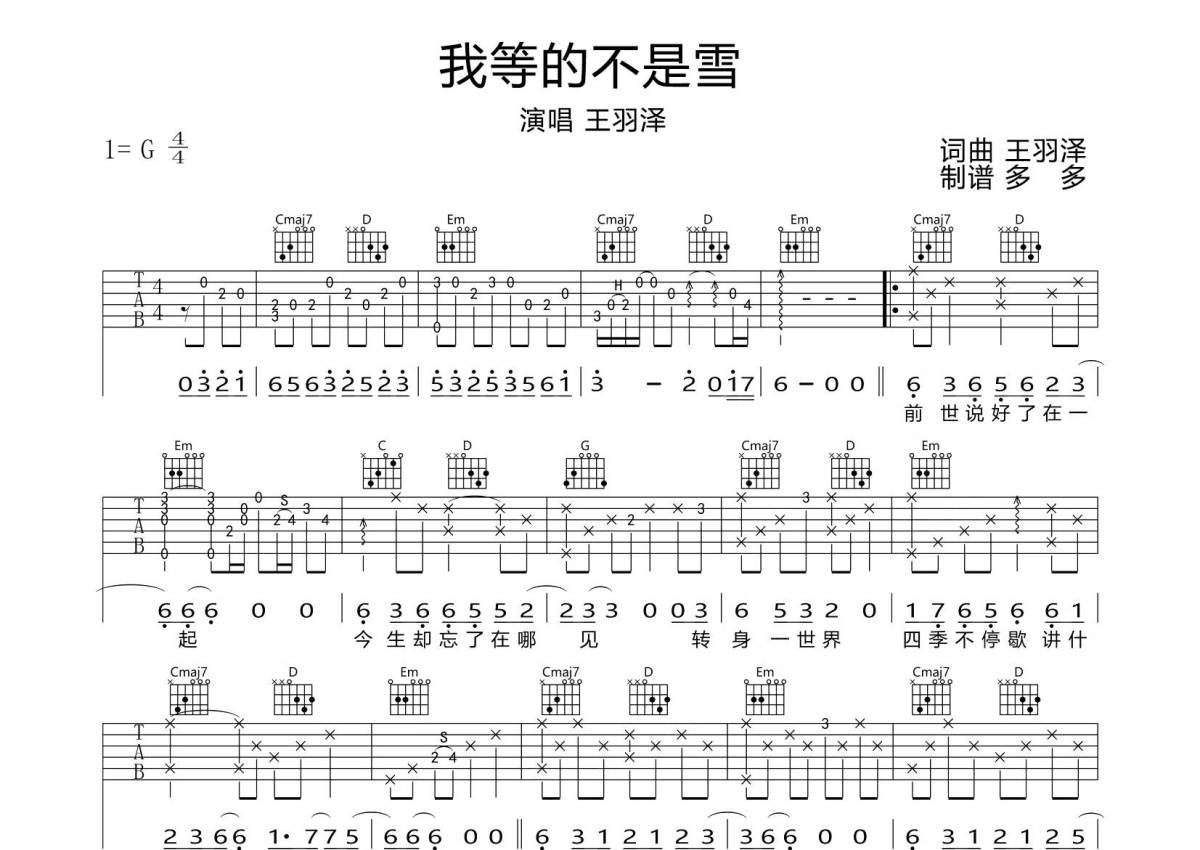 王羽泽《我等的不是雪》吉他谱 - G调弹唱六线谱 - 专辑版