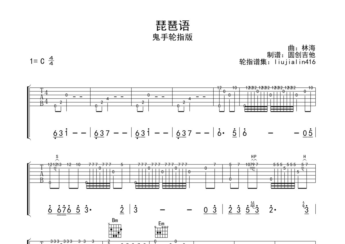 《琵琶语》是新疆鬼手演唱的一首歌曲,鬼手同版,拍号为4/4拍,歌曲原调为C调,本吉他谱采用的是C调指法编配,演奏时不需要使用变调夹即为原调,这份吉他谱共有三张高清图谱,图谱由 @圆创吉他谱 编配上传,图谱使用六线谱编配,曲谱配备了相关的音频提供试听,使用这份琵琶语吉他谱,可以让你更加方便地掌握这首歌曲的演奏技巧,快来尝试吧。鬼手同版独奏谱 指法简单 和弦简单 练习轮指的经典曲目现选择。