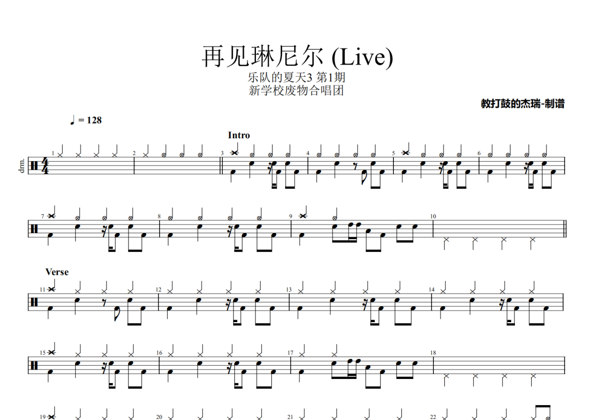 《再见琳尼尔 (Live)》是新学校废物合唱团演唱的一首歌曲,乐队的夏天3 第1期,拍号为4/4拍,歌曲速度为每分钟128拍,这份架子鼓谱共有三张高清图谱,图谱由 @Jerry 编配上传,图谱使用五线谱编配,使用这份再见琳尼尔 (Live)架子鼓谱,你将能够轻松地敲打出这首新学校废物合唱团的再见琳尼尔 (Live),快来尝试吧。
