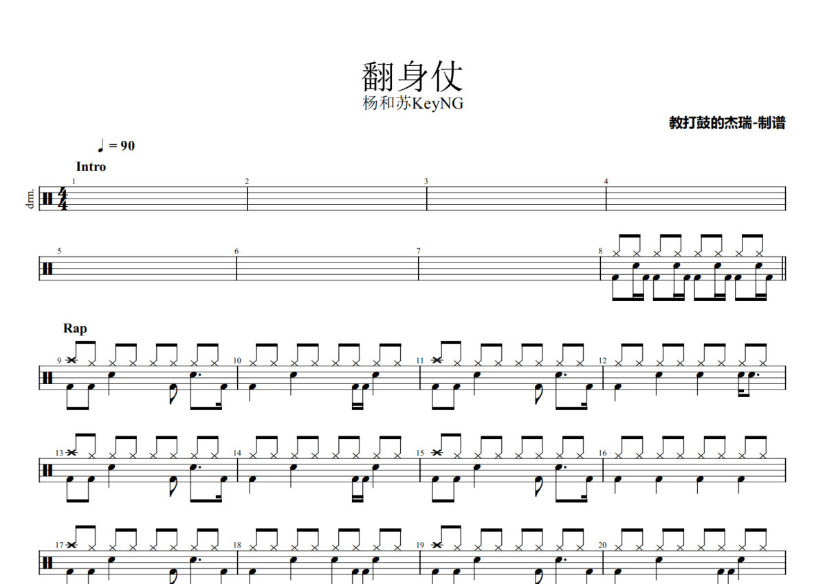 《翻身仗》是杨和苏KeyNG、早安演唱的一首歌曲,拍号为4/4拍,歌曲速度为每分钟90拍,这份架子鼓谱共有两张高清图谱,图谱由 @Jerry 编配上传,图谱使用五线谱编配,使用这份翻身仗架子鼓谱,你将能够轻松地敲打出这首杨和苏KeyNG、早安的翻身仗,快来尝试吧。