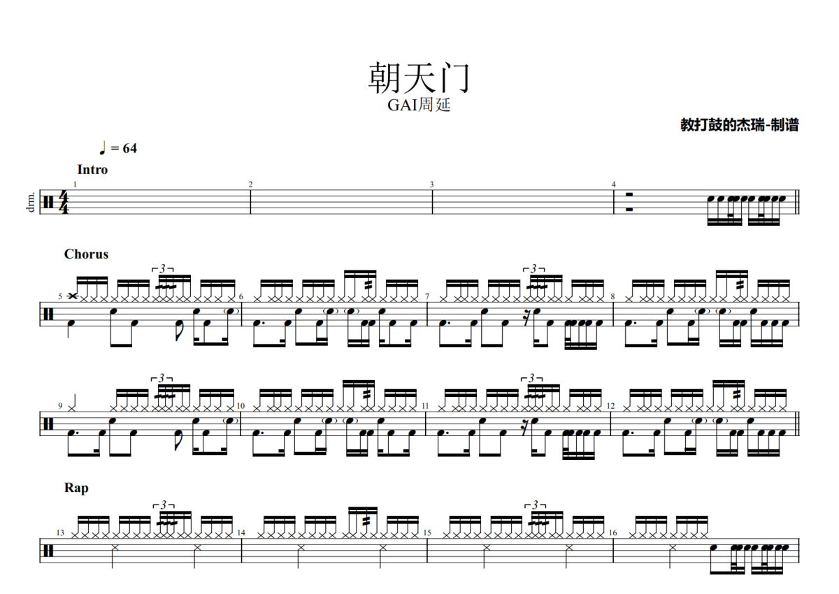 《朝天门》是GAI周延演唱的一首歌曲,拍号为4/4拍,歌曲速度为每分钟64拍,这份架子鼓谱共有两张高清图谱,图谱由 @Jerry 编配上传,图谱使用五线谱编配,使用这份朝天门架子鼓谱,你将能够轻松地敲打出这首GAI周延的朝天门,快来尝试吧。