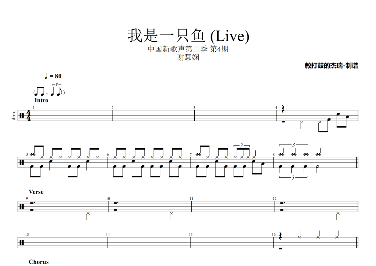 《我是一只鱼 (Live)》是谢慧娴演唱的一首歌曲,中国新歌声第二季 第4期,拍号为4/4拍,歌曲速度为每分钟80拍,这份架子鼓谱共有三张高清图谱,图谱由 @Jerry 编配上传,图谱使用五线谱编配,使用这份我是一只鱼 (Live)架子鼓谱,你将能够轻松地敲打出这首谢慧娴的我是一只鱼 (Live),快来尝试吧。