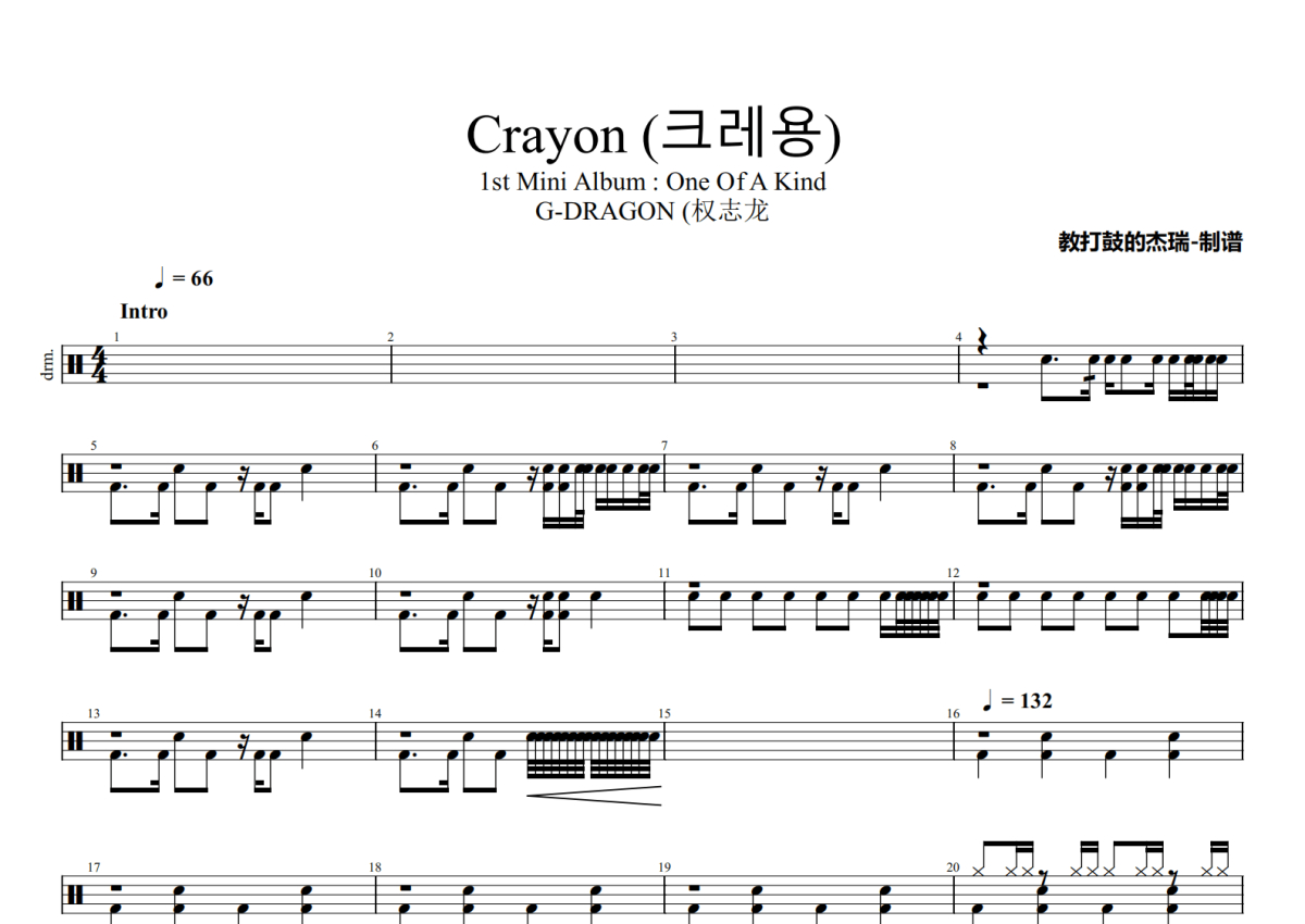 《Crayon (크레용)》是G-DRAGON (权志龙演唱的一首歌曲,1st Mini Album : One Of A Kind,这份架子鼓谱共有两张高清图谱,图谱由 @Jerry 编配上传,图谱使用五线谱编配,使用这份Crayon (크레용)架子鼓谱,你将能够轻松地敲打出这首G-DRAGON (权志龙的Crayon (크레용),快来尝试吧。
