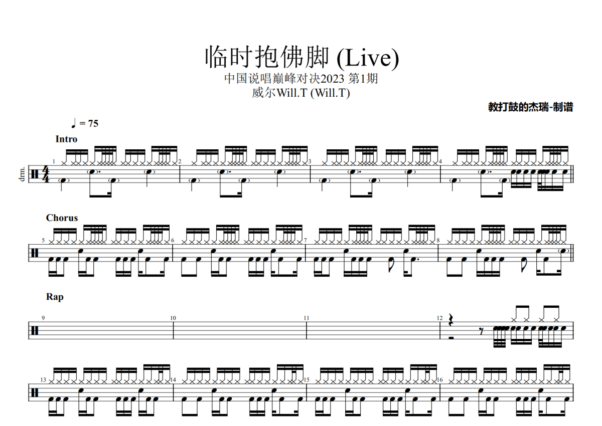 威尔Will.T (Will.T)《临时抱佛脚 (Live)》架子鼓谱 - 中国说唱巅峰对决2023 第1期