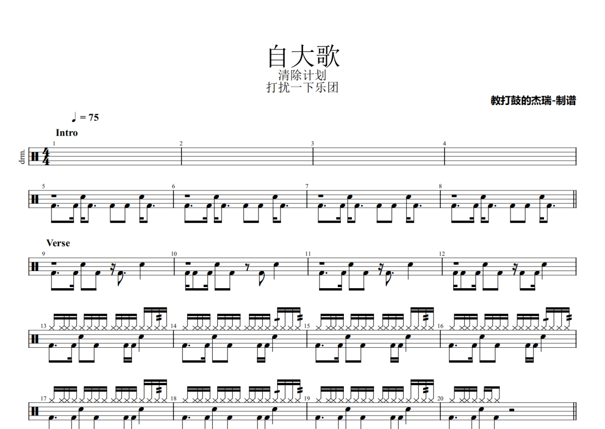 《自大歌》是打扰一下乐团演唱的一首歌曲,清除计划,拍号为4/4拍,歌曲速度为每分钟75拍,这份架子鼓谱共有两张高清图谱,图谱由 @Jerry 编配上传,图谱使用五线谱编配,使用这份自大歌架子鼓谱,你将能够轻松地敲打出这首打扰一下乐团的自大歌,快来尝试吧。
