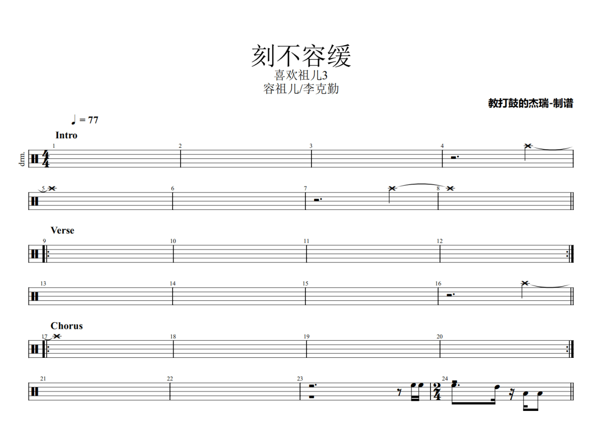 《刻不容缓》是容祖儿/李克勤演唱的一首歌曲,喜欢祖儿3,拍号为4/4拍,歌曲速度为每分钟77拍,这份架子鼓谱共有两张高清图谱,图谱由 @Jerry 编配上传,图谱使用五线谱编配,使用这份刻不容缓架子鼓谱,你将能够轻松地敲打出这首容祖儿/李克勤的刻不容缓,快来尝试吧。