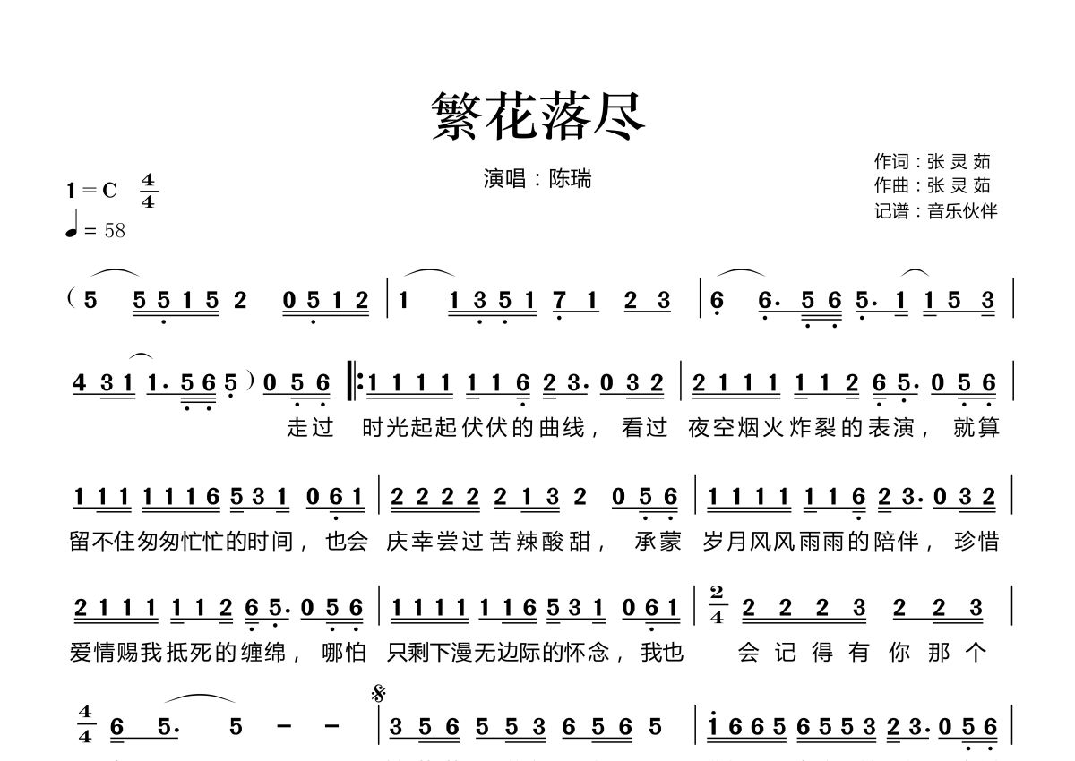 《繁花落尽》是陈瑞演唱的一首歌曲,这份简谱共有一张高清图谱,图谱由 @音乐伙伴 编配上传。