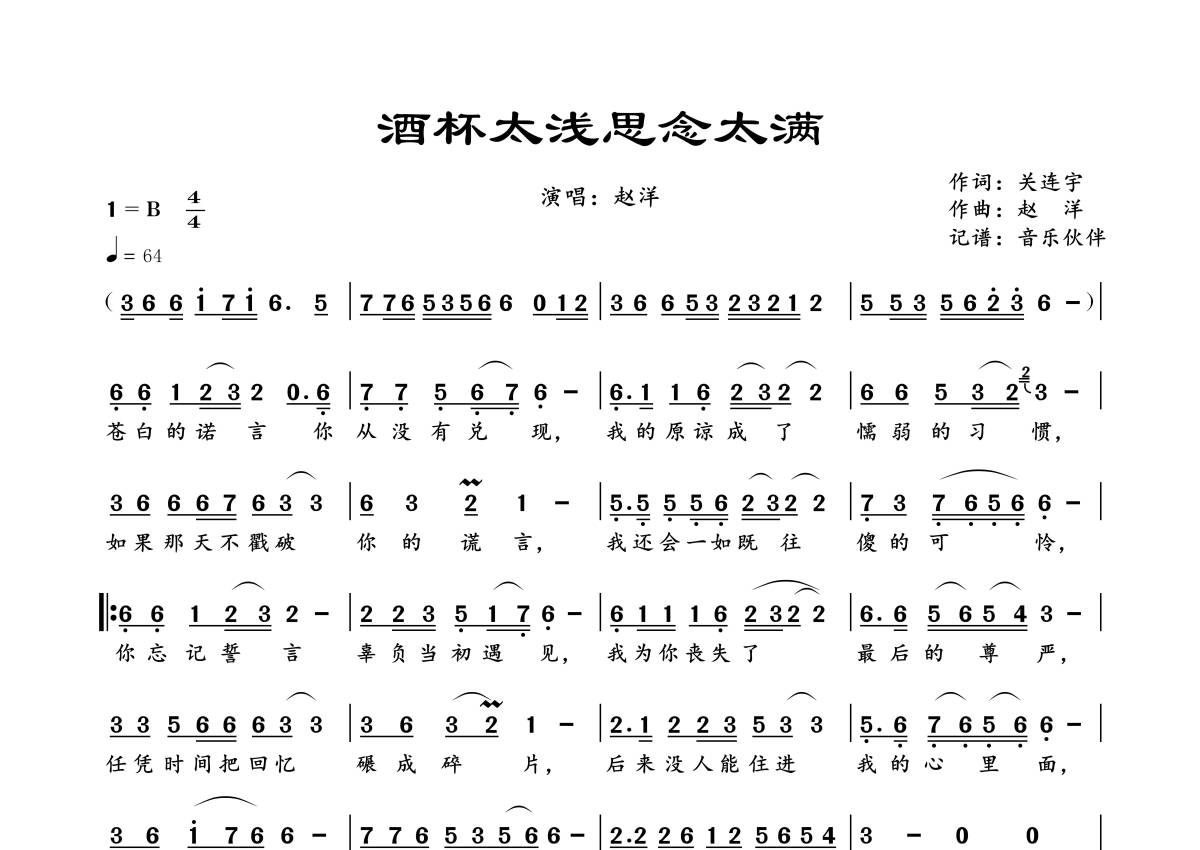 《酒杯太浅思念太满》是赵洋演唱的一首歌曲,拍号为4/4拍,歌曲速度为每分钟64拍,这份简谱共有一张高清图谱,图谱由 @音乐伙伴 编配上传。