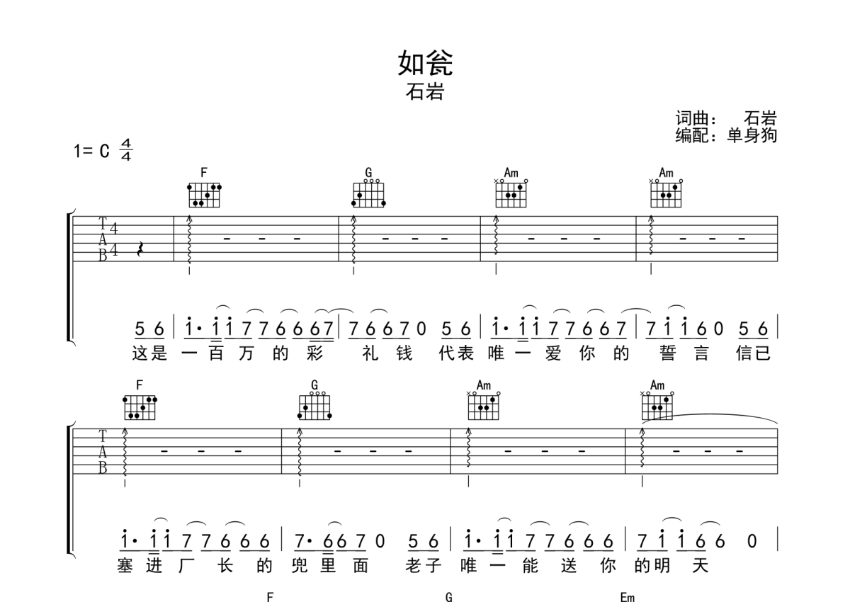 石岩《如瓮》吉他谱 - C调弹唱六线谱