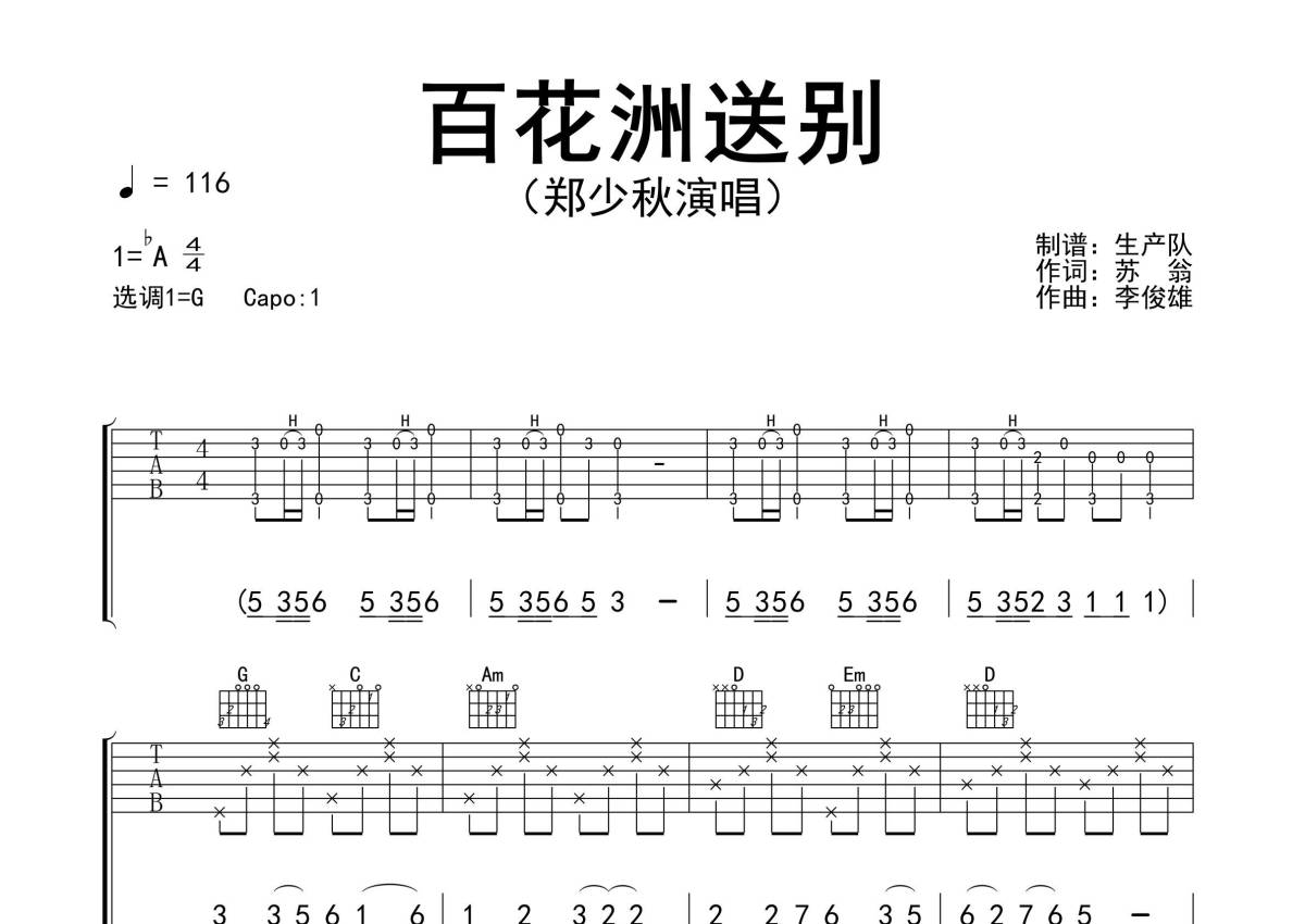 《百花洲送别》是郑少秋演唱的一首歌曲,精编完美版,拍号为4/4拍,歌曲速度为每分钟116拍,歌曲原调为Ab调,但由于原调指法比较难,为了方便弹奏,本吉他谱采用的是G调指法编配,变调夹1品弹奏即为原调,当然也可以根据自己的音域改变变调夹位置,或者通过改变和弦调性,以方便自己弹奏,这份吉他谱共有两张高清图谱,图谱由 @生产队 编配上传,图谱使用六线谱编配,包含吉他和弦指法、简谱以及歌词部分,使用这份百花洲送别吉他谱,可以让你更加方便地掌握这首歌曲的弹唱技巧,快来尝试吧。《百花洲送别》是郑少秋演唱的歌曲,该曲也是《路边的野花不要采》粤语版。本吉他谱根据原版G调指法编配,完整的前奏、间奏、尾奏和SOLO编配,怀旧经典!。
