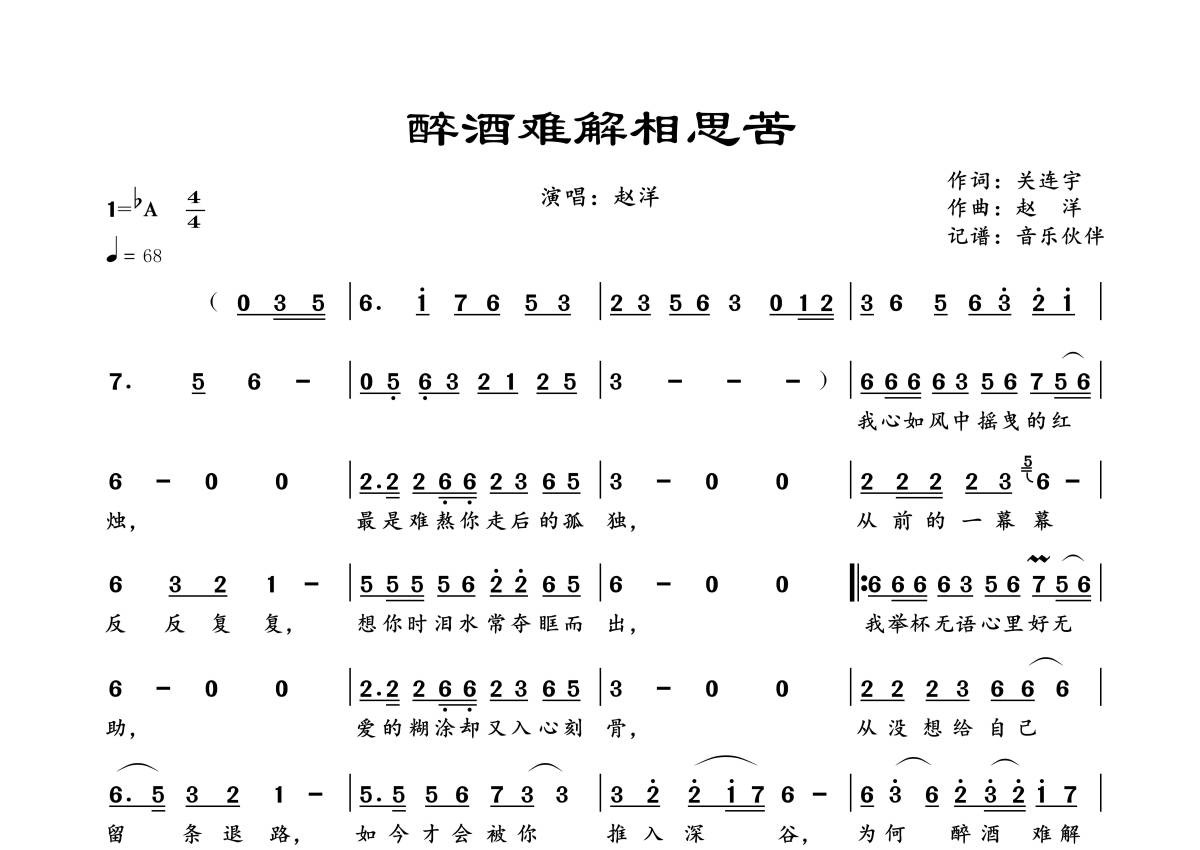 《醉酒难解相思苦》是赵洋演唱的一首歌曲,拍号为4/4拍,歌曲速度为每分钟68拍,这份简谱共有一张高清图谱,图谱由 @音乐伙伴 编配上传。
