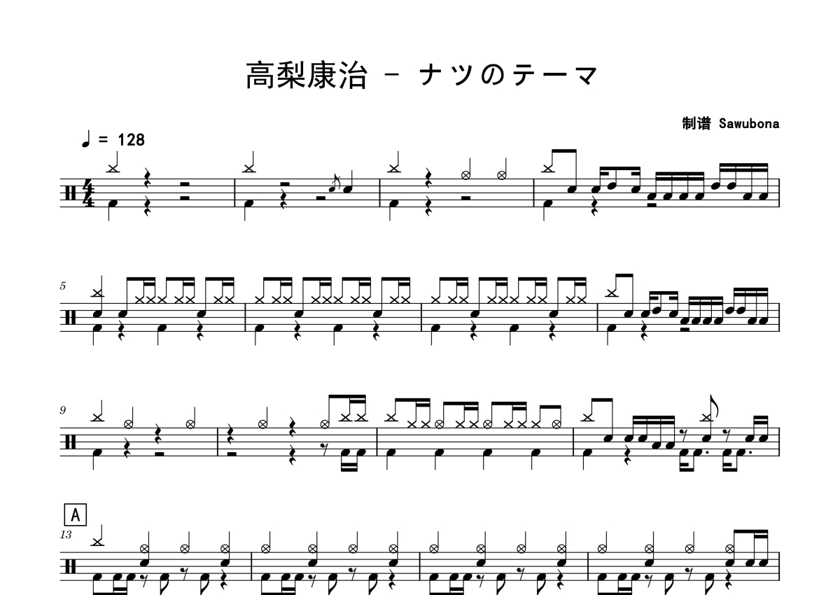 《ナツのテーマ》是高梨康治演唱的一首歌曲,拍号为4/4拍,歌曲速度为每分钟128拍,这份架子鼓谱共有两张高清图谱,图谱由 @Sawubona 编配上传,图谱使用五线谱编配,使用这份ナツのテーマ架子鼓谱,你将能够轻松地敲打出这首高梨康治的ナツのテーマ,快来尝试吧。