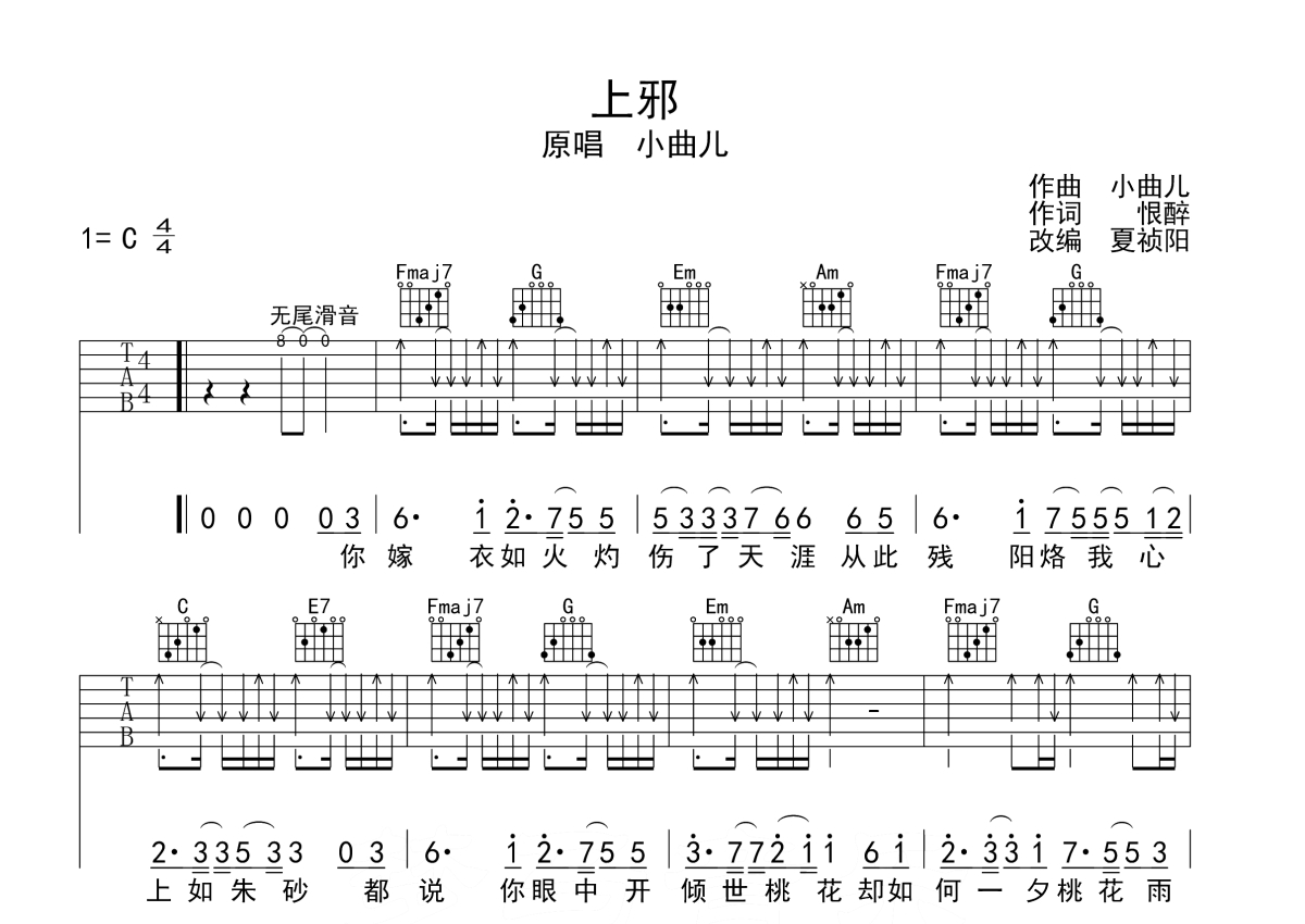 小曲儿《上邪》吉他谱 - C调弹唱六线谱
