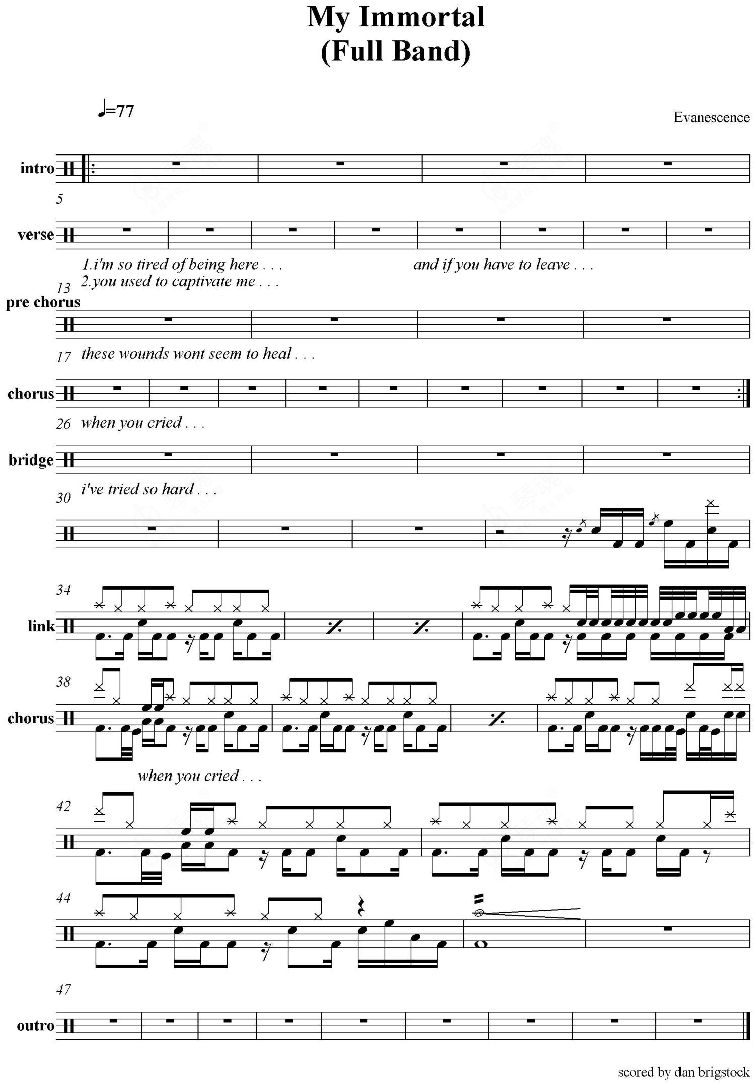 《My Immortal》是Evanescence演唱的一首歌曲,拍号为4/4拍,这份架子鼓谱共有一张高清图谱,图谱由 @微信用户 编配上传,图谱使用五线谱编配,使用这份My Immortal架子鼓谱,你将能够轻松地敲打出这首Evanescence的My Immortal,快来尝试吧。