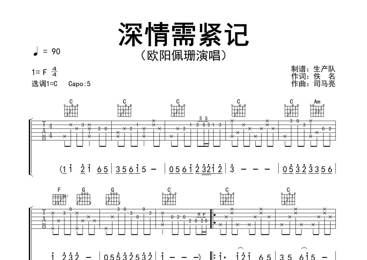《深情需紧记》是欧阳佩珊演唱的一首歌曲,精编完美版,拍号为4/4拍,歌曲速度为每分钟90拍,歌曲原调为F调,但由于原调指法比较难,为了方便弹奏,本吉他谱采用的是C调指法编配,变调夹5品弹奏即为原调,当然也可以根据自己的音域改变变调夹位置,或者通过改变和弦调性,以方便自己弹奏,这份吉他谱共有两张高清图谱,图谱由 @生产队 编配上传,图谱使用六线谱编配,包含吉他和弦指法、简谱以及歌词部分,使用这份深情需紧记吉他谱,可以让你更加方便地掌握这首歌曲的弹唱技巧,快来尝试吧。《深情需紧记》是由欧阳佩珊演唱的歌曲,收录于《心灵随雾散》专辑中。本吉他谱根据原版C调指法编配,精准的前奏、间奏、尾奏和SOLO编配,怀旧经典!。