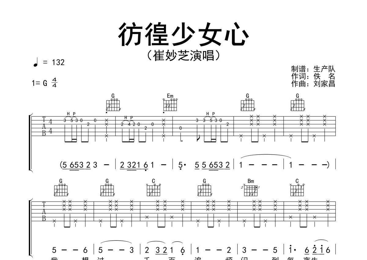 《彷徨少女心》是崔妙芝演唱的一首歌曲,精编完美版,拍号为4/4拍,歌曲速度为每分钟132拍,歌曲原调为G调,本吉他谱采用的是G调指法编配,演奏时不需要使用变调夹即为原调,这份吉他谱共有三张高清图谱,图谱由 @生产队 编配上传,图谱使用六线谱编配,包含吉他和弦指法、简谱以及歌词部分,使用这份彷徨少女心吉他谱,可以让你更加方便地掌握这首歌曲的弹唱技巧,快来尝试吧。《彷徨少女心》是由崔妙芝演唱的经典歌曲。本吉他谱根据原版G调指法编配,完整的前奏、间奏、尾奏和SOLO编配,怀旧经典!。