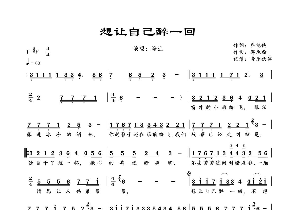 《想让自己醉一回》是海生演唱的一首歌曲,拍号为4/4拍,歌曲速度为每分钟60拍,这份简谱共有一张高清图谱,图谱由 @音乐伙伴 编配上传。