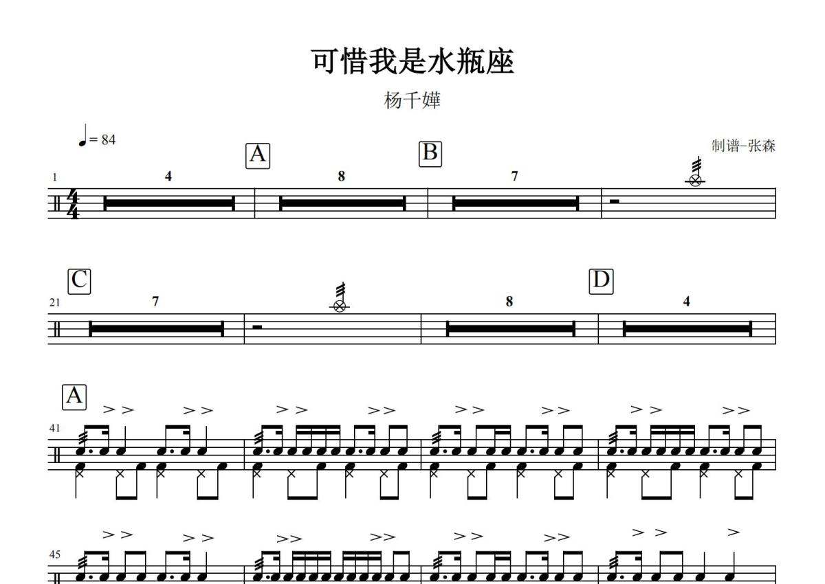 《可惜我是水瓶座》是杨千嬅演唱的一首歌曲,这份鼓谱共有两张高清图谱,图谱由 @打鼓谱 编配上传,图谱使用五线谱编配,使用这份可惜我是水瓶座架子鼓谱,你将能够轻松地敲打出这首杨千嬅的可惜我是水瓶座,快来尝试吧。香港音乐人黄伟文与杨千嬅交情深厚,《可惜我是水瓶座》是他为杨千嬅量身打造的情歌。杨千嬅与郑中基分手后,她坦言很不开心,总是约朋友喝酒。黄伟文表示,当时杨千嬅收工后走进黄伟文喝酒的夜店,连续点了8杯长岛冰茶,而黄伟文也没问那个令她落泪的人是谁,就静静地陪杨千嬅喝。该曲当中的一句「要是回去,没有止痛药水,拿来长岛冰茶换我半晚安睡」就是杨千嬅的亲身经历。