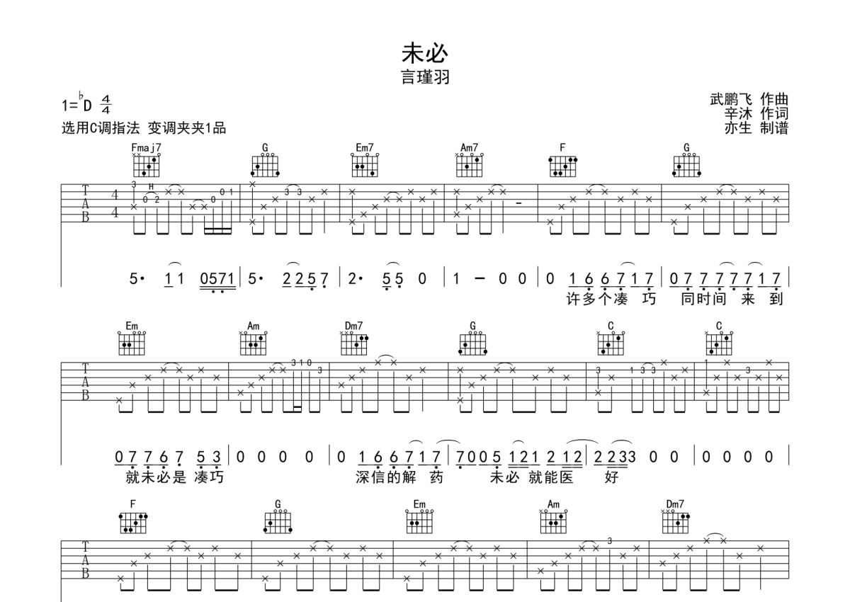 《未必》是言瑾羽演唱的一首歌曲,拍号为4/4拍,歌曲原调为Db调,但由于原调指法比较难,为了方便弹奏,本吉他谱采用的是C调指法编配,变调夹1品弹奏即为原调,当然也可以根据自己的音域改变变调夹位置,或者通过改变和弦调性,以方便自己弹奏,这份吉他谱共有两张高清图谱,图谱由 @亦生 编配上传,图谱使用六线谱编配,包含吉他和弦指法、简谱以及歌词部分,使用这份未必吉他谱,可以让你更加方便地掌握这首歌曲的弹唱技巧,快来尝试吧。