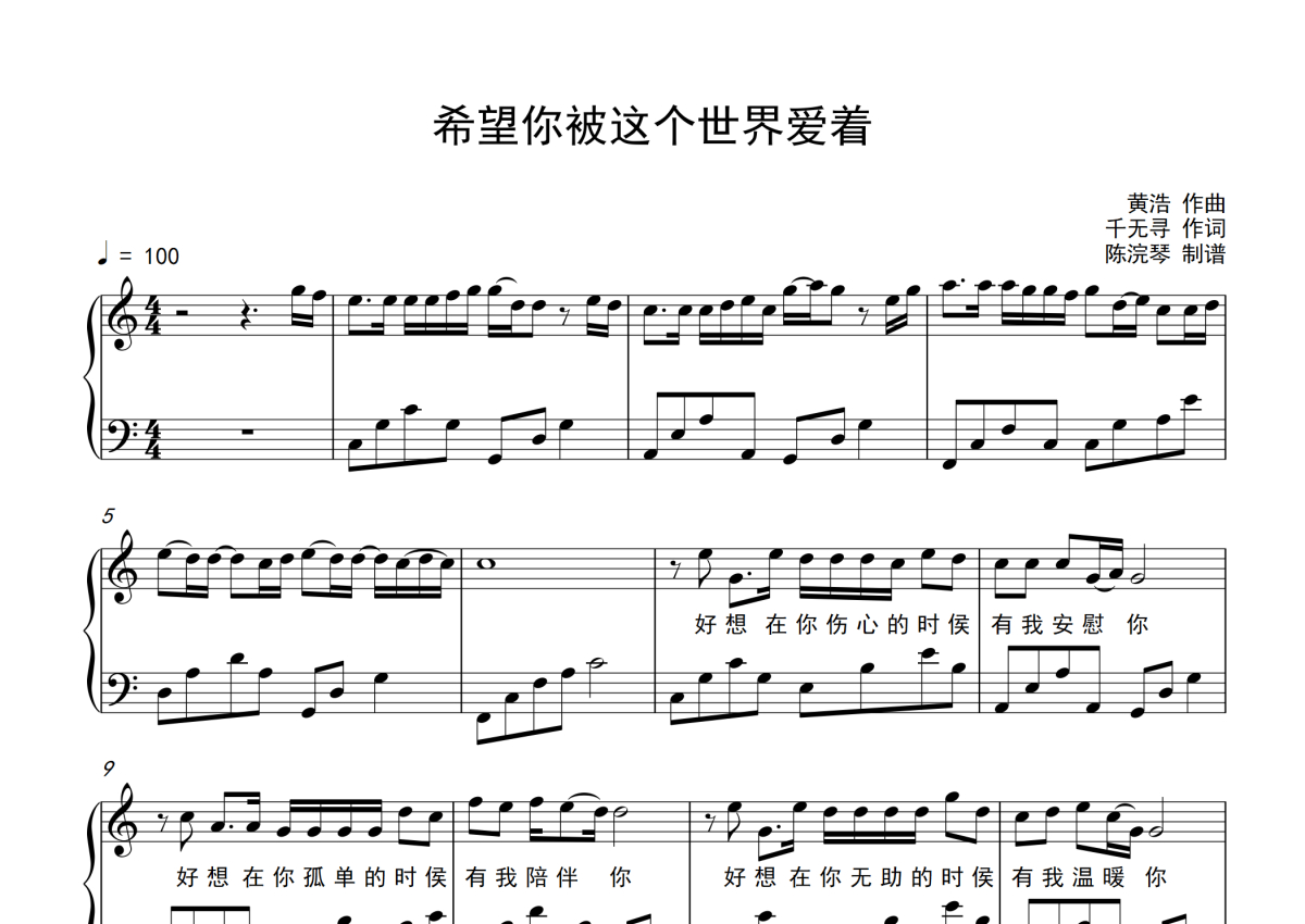 《希望你被这个世界爱着》是吕口口演唱的一首歌曲,拍号为4/4拍,歌曲速度为每分钟100拍,这份钢琴谱共有两张高清图谱,图谱由 @月隐云先知 编配上传,曲谱配备了相关的音频提供试听,使用这份希望你被这个世界爱着钢琴谱,可以让你更加方便地掌握这首歌曲的演奏技巧,快来尝试吧。C调简单版钢琴谱,适合新手练习使用。