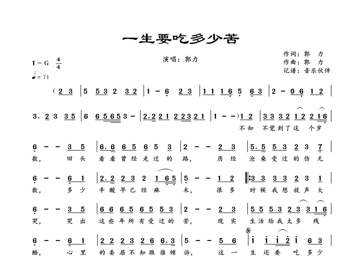 《一生要吃多少苦》是郭力演唱的一首歌曲,拍号为4/4拍,歌曲速度为每分钟74拍,这份简谱共有一张高清图谱,图谱由 @音乐伙伴 编配上传。