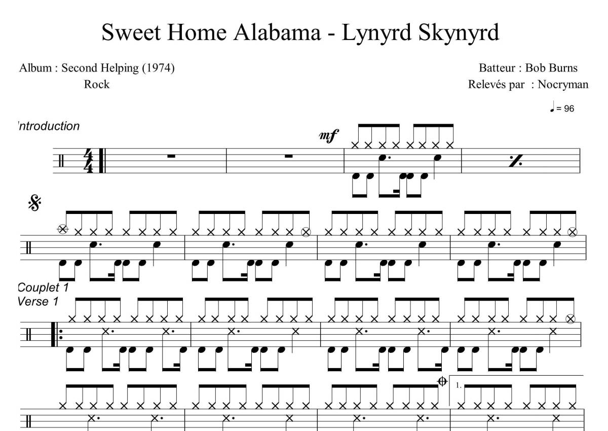 《Sweet Home Alabama》是Lynyrd Skynyrd演唱的一首歌曲,拍号为4/4拍,歌曲速度为每分钟96拍,这份架子鼓谱共有三张高清图谱,图谱由 @微信用户 编配上传,图谱使用五线谱编配,使用这份Sweet Home Alabama架子鼓谱,你将能够轻松地敲打出这首Lynyrd Skynyrd的Sweet Home Alabama,快来尝试吧。