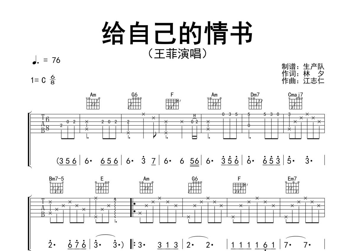 《给自己的情书》是王菲演唱的一首歌曲,精编完美版,拍号为6/8拍,歌曲速度为每分钟76拍,歌曲原调为C调,本吉他谱采用的是C调指法编配,演奏时不需要使用变调夹即为原调,这份吉他谱共有三张高清图谱,图谱由 @生产队 编配上传,图谱使用六线谱编配,包含吉他和弦指法、简谱以及歌词部分,使用这份给自己的情书吉他谱,可以让你更加方便地掌握这首歌曲的弹唱技巧,快来尝试吧。《给自己的情书》是林夕作词、江志仁作曲,王菲演唱的歌曲,亦是电视剧《婚前昏后》的主题曲 ,该曲的普通话版为《笑忘书》,均收录于王菲2000年发行的专辑《寓言》中。本吉他谱根据原版C调指法编配,完整的前奏、间奏、尾奏编配,怀旧经典!。