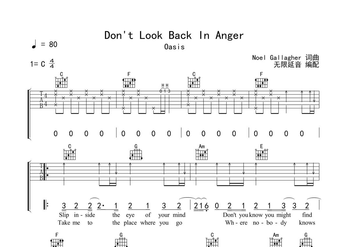 《Don't Look Back In Anger》是Oasis演唱的一首歌曲,拍号为4/4拍,歌曲速度为每分钟80拍,歌曲原调为C调,本吉他谱采用的是C调指法编配,演奏时不需要使用变调夹即为原调,这份吉他谱共有四张高清图谱,图谱由 @无限延音 编配上传,图谱使用六线谱编配,包含吉他和弦指法、简谱以及歌词部分,使用这份Don't Look Back In Anger吉他谱,可以让你更加方便地掌握这首歌曲的弹唱技巧,快来尝试吧。