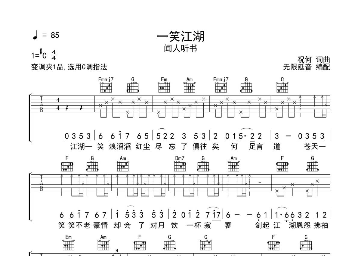 《一笑江湖》是闻人听书演唱的一首歌曲,拍号为4/4拍,歌曲速度为每分钟85拍,歌曲原调为Db调,但由于原调指法比较难,为了方便弹奏,本吉他谱采用的是C调指法编配,变调夹1品弹奏即为原调,当然也可以根据自己的音域改变变调夹位置,或者通过改变和弦调性,以方便自己弹奏,这份吉他谱共有两张高清图谱,图谱由 @无限延音 编配上传,图谱使用六线谱编配,包含吉他和弦指法、简谱以及歌词部分,使用这份一笑江湖吉他谱,可以让你更加方便地掌握这首歌曲的弹唱技巧,快来尝试吧。