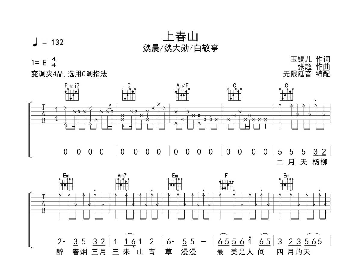 《上春山》是白敬亭/魏大勋/魏晨演唱的一首歌曲,拍号为4/4拍,歌曲速度为每分钟132拍,歌曲原调为E调,但由于原调指法比较难,为了方便弹奏,本吉他谱采用的是C调指法编配,变调夹4品弹奏即为原调,当然也可以根据自己的音域改变变调夹位置,或者通过改变和弦调性,以方便自己弹奏,这份吉他谱共有三张高清图谱,图谱由 @无限延音 编配上传,图谱使用六线谱编配,包含吉他和弦指法、简谱以及歌词部分,使用这份上春山吉他谱,可以让你更加方便地掌握这首歌曲的弹唱技巧,快来尝试吧。