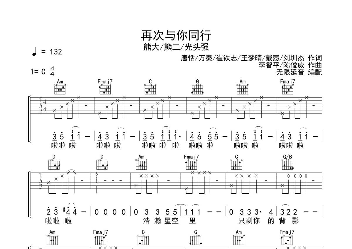 《再次与你同行》是熊大熊二光头强演唱的一首歌曲,拍号为4/4拍,歌曲速度为每分钟132拍,歌曲原调为C调,本吉他谱采用的是C调指法编配,这份吉他谱共有四张高清图谱,图谱由 @无限延音 编配上传,图谱使用六线谱编配,包含吉他和弦指法、简谱以及歌词部分,使用这份再次与你同行吉他谱,可以让你更加方便地掌握这首歌曲的弹唱技巧,快来尝试吧。