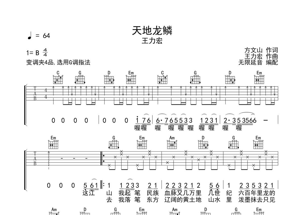 《天地龙鳞》是王力宏演唱的一首歌曲,拍号为4/4拍,歌曲速度为每分钟64拍,歌曲原调为B调,但由于原调指法比较难,为了方便弹奏,本吉他谱采用的是G调指法编配,变调夹4品弹奏即为原调,当然也可以根据自己的音域改变变调夹位置,或者通过改变和弦调性,以方便自己弹奏,这份吉他谱共有两张高清图谱,图谱由 @无限延音 编配上传,图谱使用六线谱编配,包含吉他和弦指法、简谱以及歌词部分,使用这份天地龙鳞吉他谱,可以让你更加方便地掌握这首歌曲的弹唱技巧,快来尝试吧。