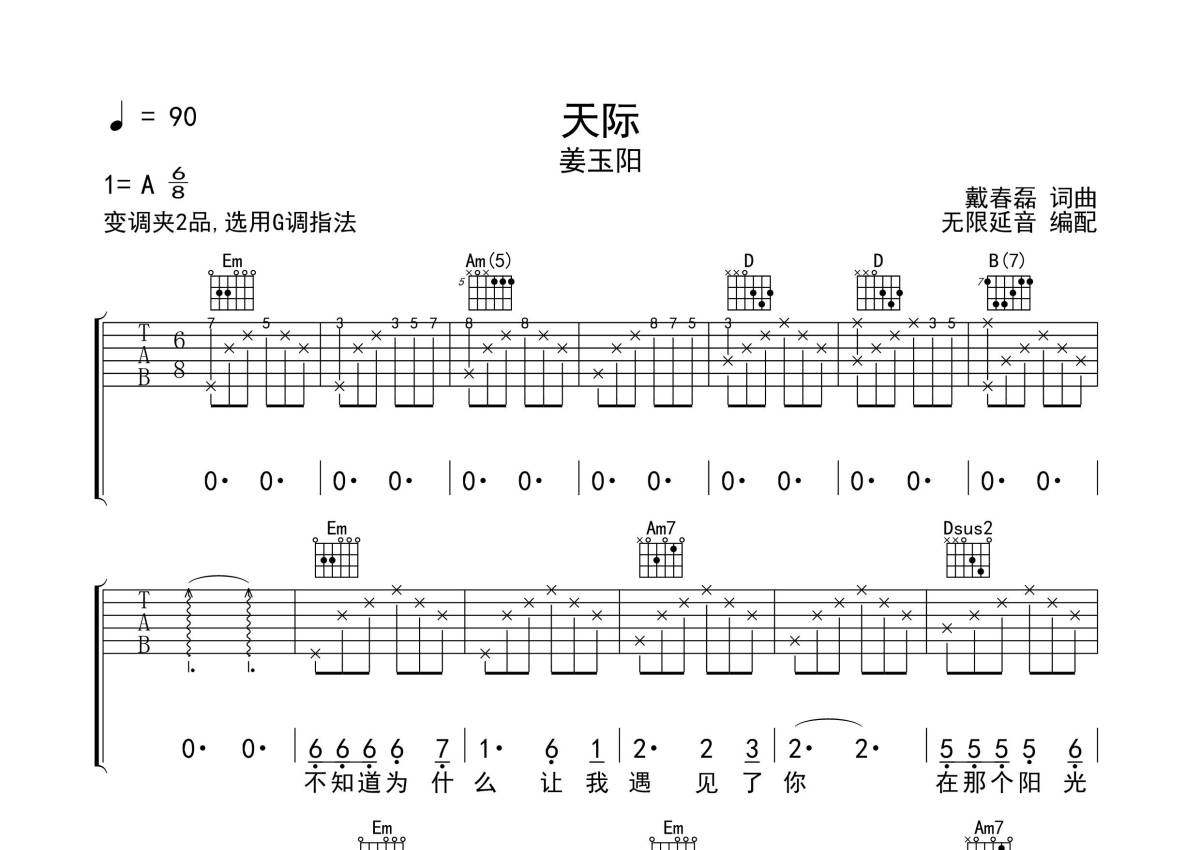天际吉他谱 - 姜玉阳 - G调弹唱六线谱