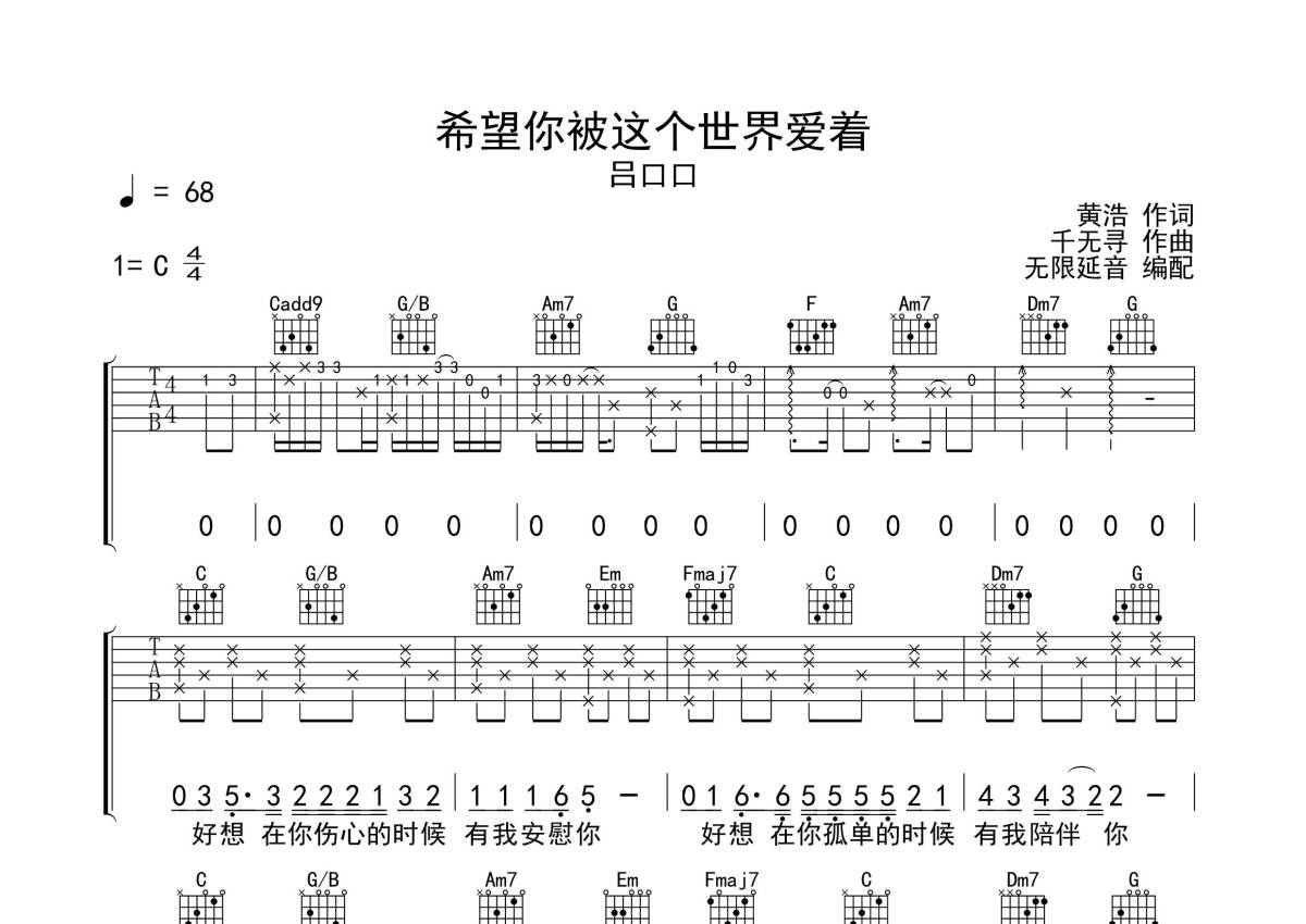 《希望你被这个世界爱着》是吕口口演唱的一首歌曲,拍号为4/4拍,歌曲速度为每分钟68拍,歌曲原调为C调,本吉他谱采用的是C调指法编配,演奏时不需要使用变调夹即为原调,这份吉他谱共有两张高清图谱,图谱由 @无限延音 编配上传,图谱使用六线谱编配,包含吉他和弦指法、简谱以及歌词部分,使用这份希望你被这个世界爱着吉他谱,可以让你更加方便地掌握这首歌曲的弹唱技巧,快来尝试吧。