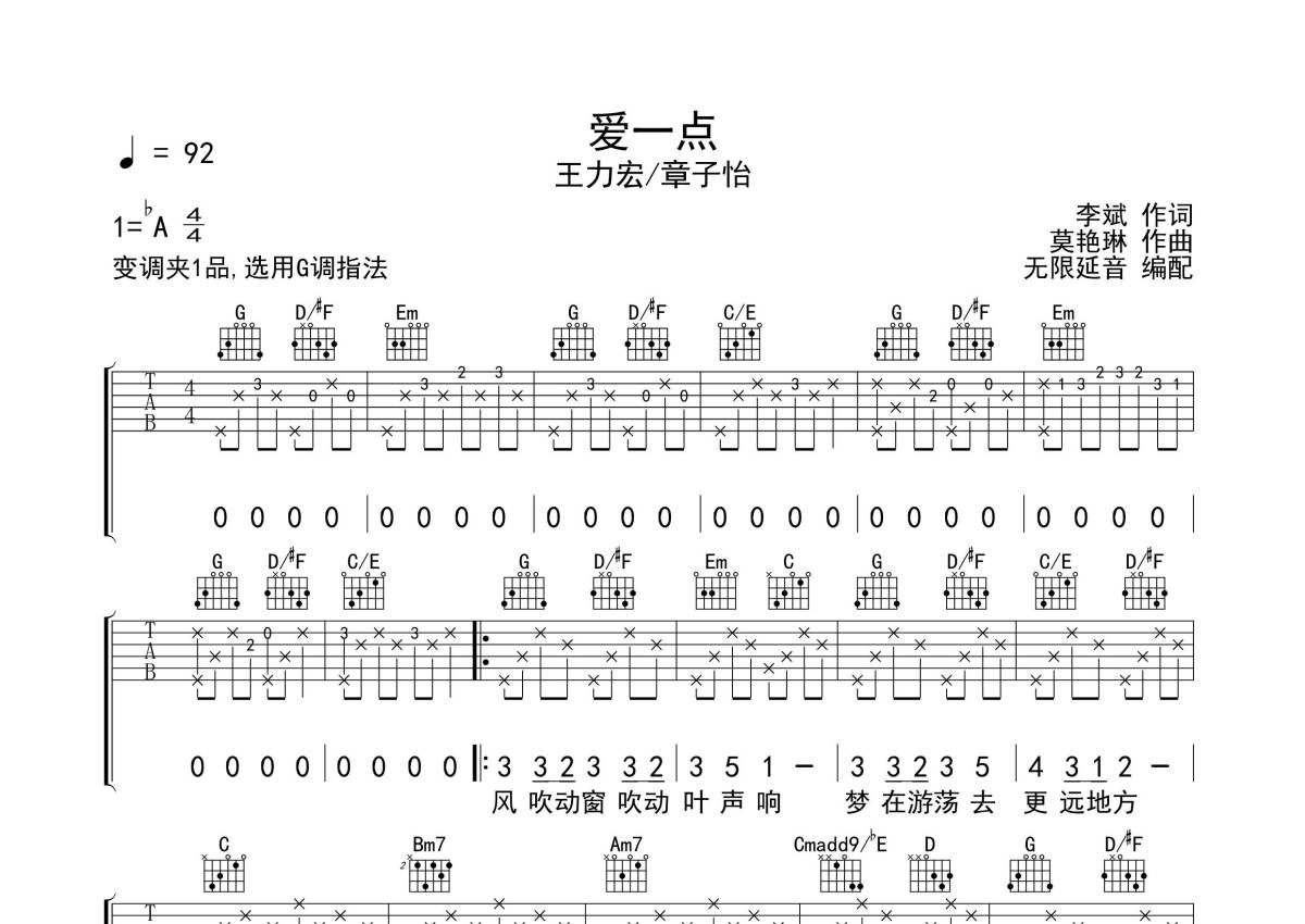 《爱一点》是王力宏/章子怡演唱的一首歌曲,拍号为4/4拍,歌曲速度为每分钟92拍,歌曲原调为Ab调,但由于原调指法比较难,为了方便弹奏,本吉他谱采用的是G调指法编配,变调夹1品弹奏即为原调,当然也可以根据自己的音域改变变调夹位置,或者通过改变和弦调性,以方便自己弹奏,这份吉他谱共有两张高清图谱,图谱由 @无限延音 编配上传,图谱使用六线谱编配,包含吉他和弦指法、简谱以及歌词部分,使用这份爱一点吉他谱,可以让你更加方便地掌握这首歌曲的弹唱技巧,快来尝试吧。