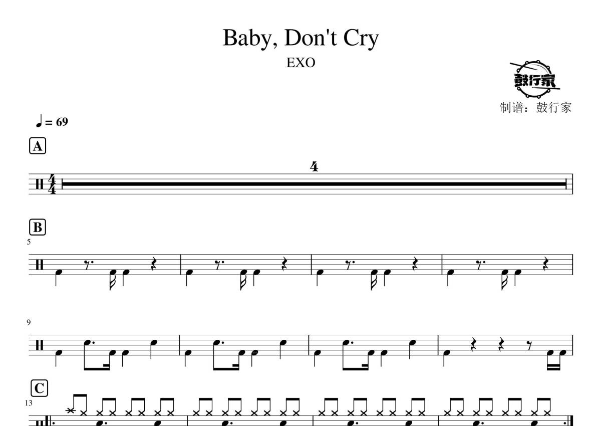 《Baby, Don't Cry》是EXO演唱的一首歌曲,拍号为4/4拍,歌曲速度为每分钟69拍,这份架子鼓谱共有两张高清图谱,图谱由 @鼓行家 编配上传,图谱使用五线谱编配,使用这份Baby, Don't Cry架子鼓谱,你将能够轻松地敲打出这首EXO的Baby, Don't Cry,快来尝试吧。