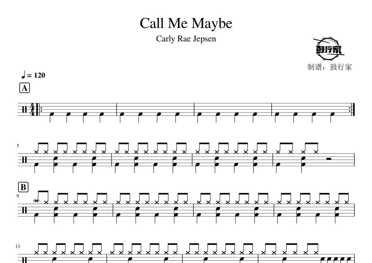 《Call Me Maybe》是Carly Rae Jepsen演唱的一首歌曲,拍号为4/4拍,歌曲速度为每分钟120拍,这份架子鼓谱共有两张高清图谱,图谱由 @鼓行家 编配上传,图谱使用五线谱编配,使用这份Call Me Maybe架子鼓谱,你将能够轻松地敲打出这首Carly Rae Jepsen的Call Me Maybe,快来尝试吧。
